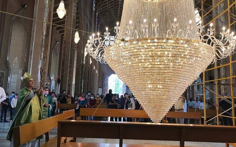 Finalmente ahora el candelabro gigante elaborado con cristal egipcio adorna el centro de la catedral del municipio de Chilapa en Guerrero.
