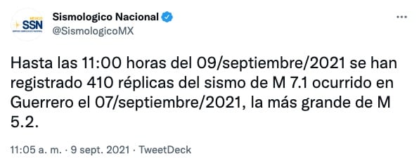 “Hasta las 11:00 horas del 09/septiembre/2021 se han registrado 410 réplicas del sismo de M 7.1 ocurrido en Guerrero el 07/septiembre/2021, la más grande de M 5.2″