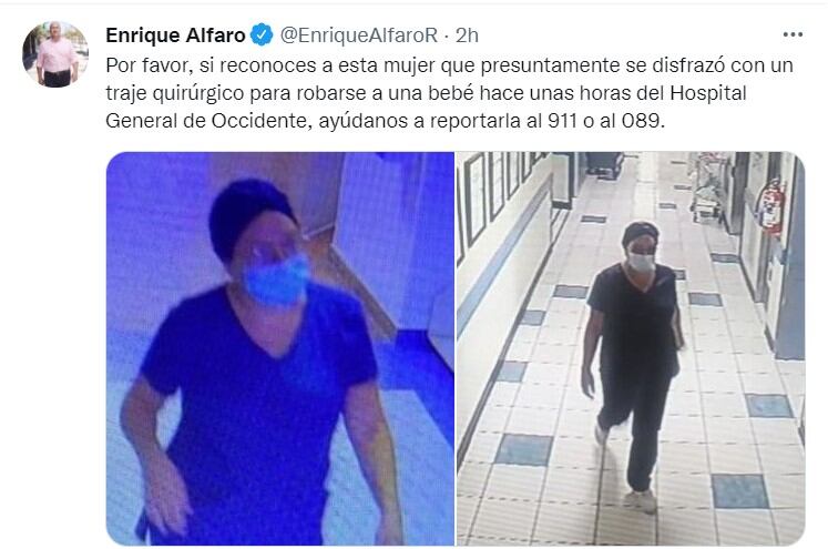 “Por favor, si reconoces a esta mujer que presuntamente se disfrazó con un traje quirúrgico para robarse a una bebé hace unas horas del Hospital General de Occidente, ayúdanos a reportarla al 911 o al 089″