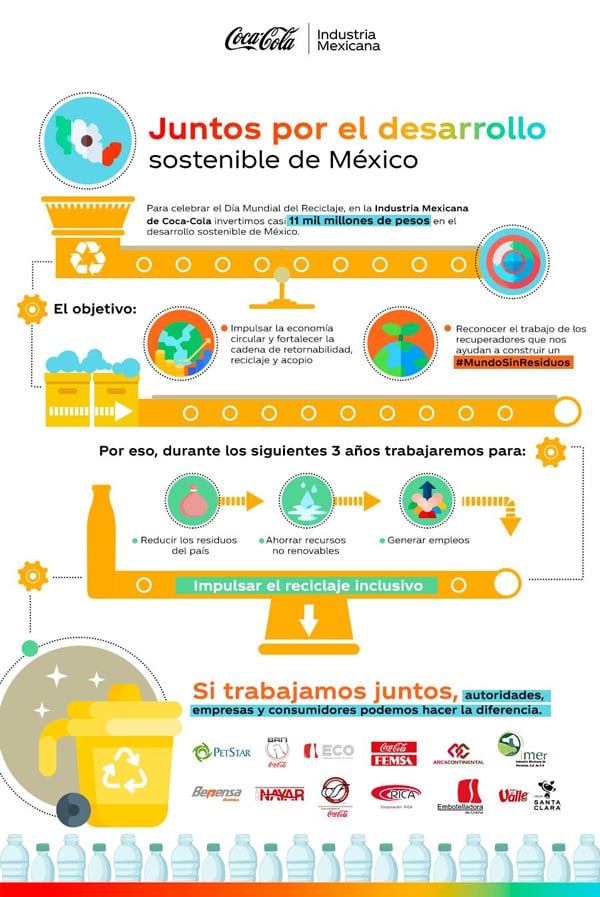 Todos estos esfuerzos de la IMCC se realizan en pos de conseguir un Mundo sin Residuos; un compromiso de desarrollo sustentable en el que la compañía y sus aliados embotelladores construyen relaciones cercanas con pepenadores y recuperadores, favorecen el empoderamiento de quienes trabajan en la cadena de recolección, además de innovar en los métodos de producción.