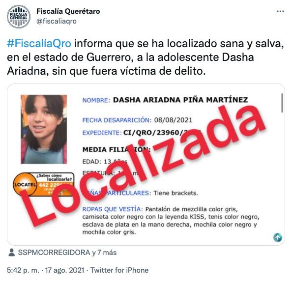 La Fiscalía de Querétaro confirmó el 17 de agosto que se localizó a Dasha en Guerrero, luego de que se supiera por última vez de ella el 8 de agosto.