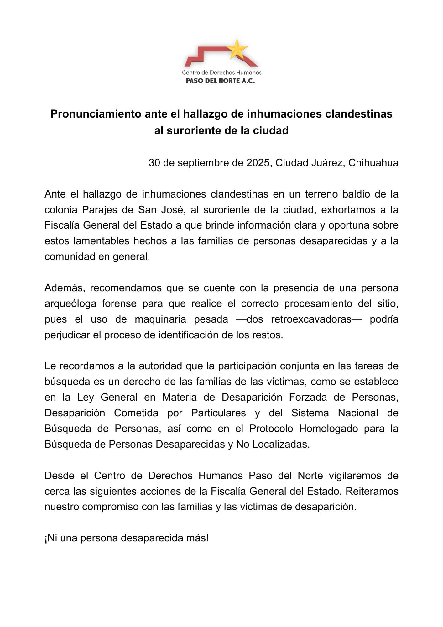 Ante esto, la asociación Centro de Derechos Humanos Paso del Norte solicitó a la Fiscalía de Chihuahua brindar información clara y oportuna de este caso a las familias de personas desaparecidas.