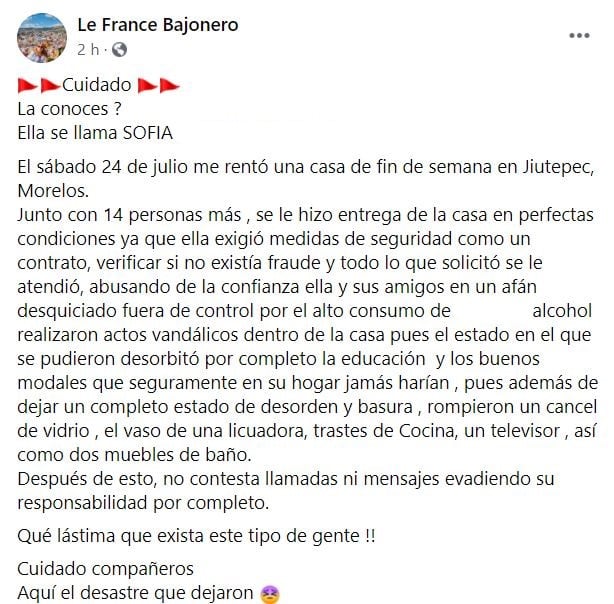 Sin embargo, el usuario Le France Bajonero, quien se dedica a rentar casas en Morelos, denunció que la casa que rentó a Sofía fue entregada con diferentes destrozos que el arrendatario calificó como vandálicos.