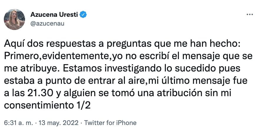 Primero,evidentemente,yo no escribí el mensaje que se me atribuye. Estamos investigando lo sucedido pues estaba a punto de entrar al aire,mi último mensaje fue a las 21.30 y alguien se tomó una atribución sin mi consentimiento”