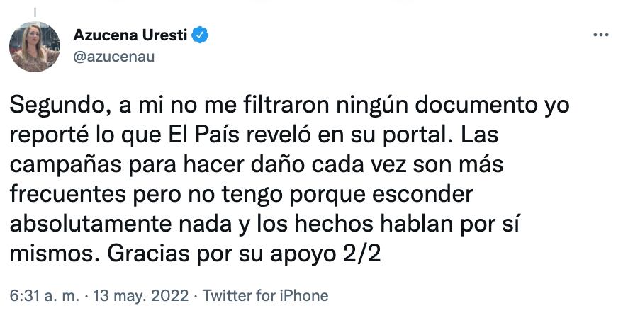“Segundo, a mi no me filtraron ningún documento yo reporté lo que El País reveló en su portal. Las campañas para hacer daño cada vez son más frecuentes pero no tengo porque esconder absolutamente nada y los hechos hablan por sí mismos. Gracias por su apoyo”