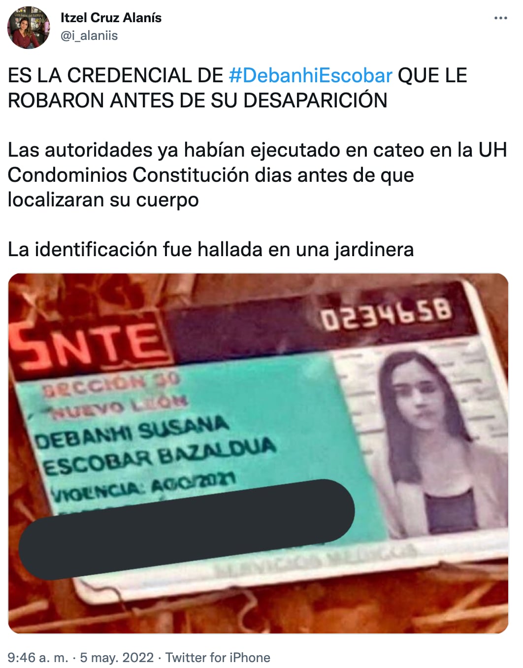 La credencial de Debanhi Escobar que fue encontrada la mañana de este 5 de mayo en los Condominios Constitución, había sido robada antes de desaparecer.