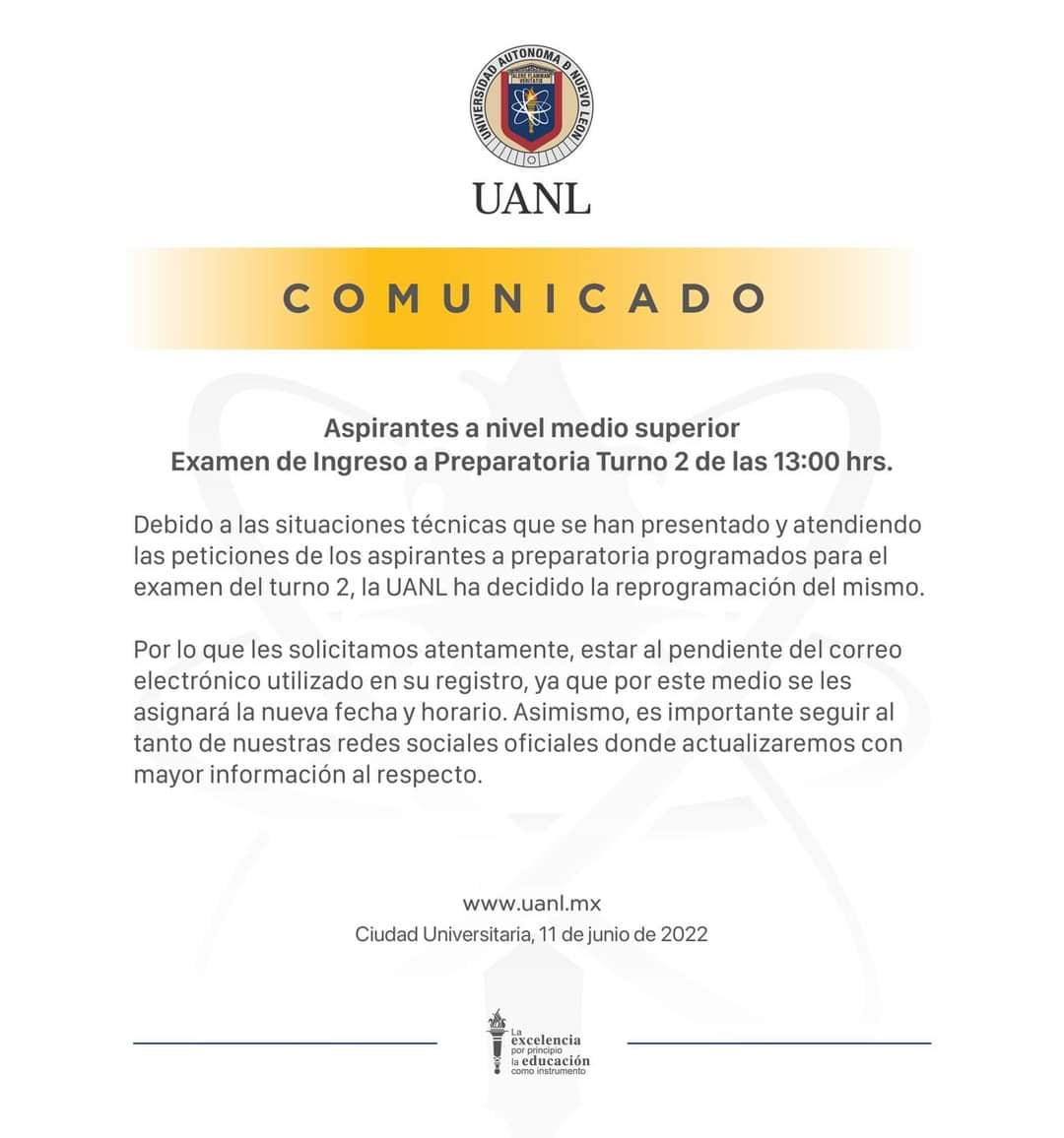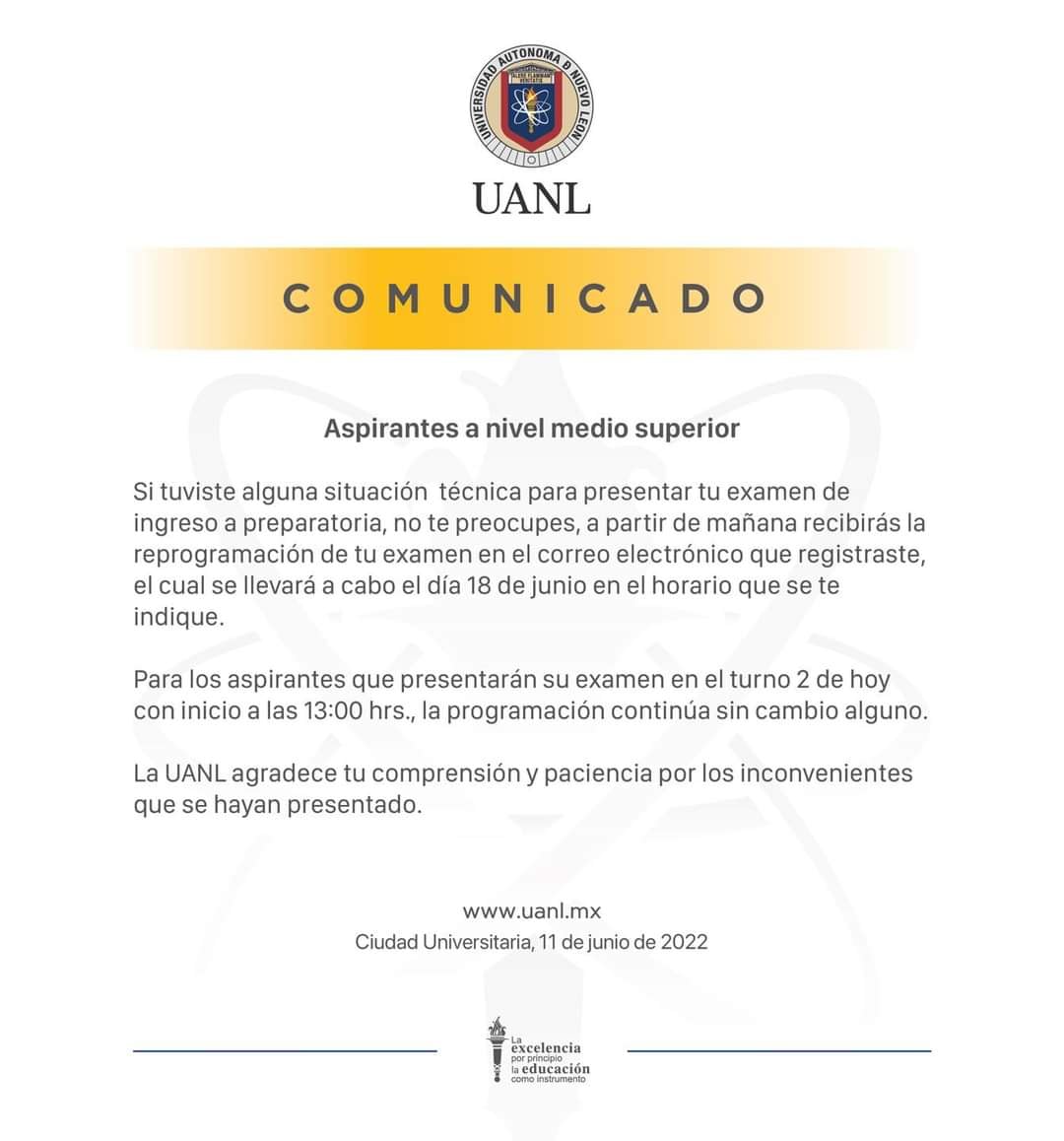 Esta reprogramación de exámenes de ingreso se realizará el próximo 18 de junio en varios horarios, de acuerdo con la Universidad Autónoma de Nuevo León.