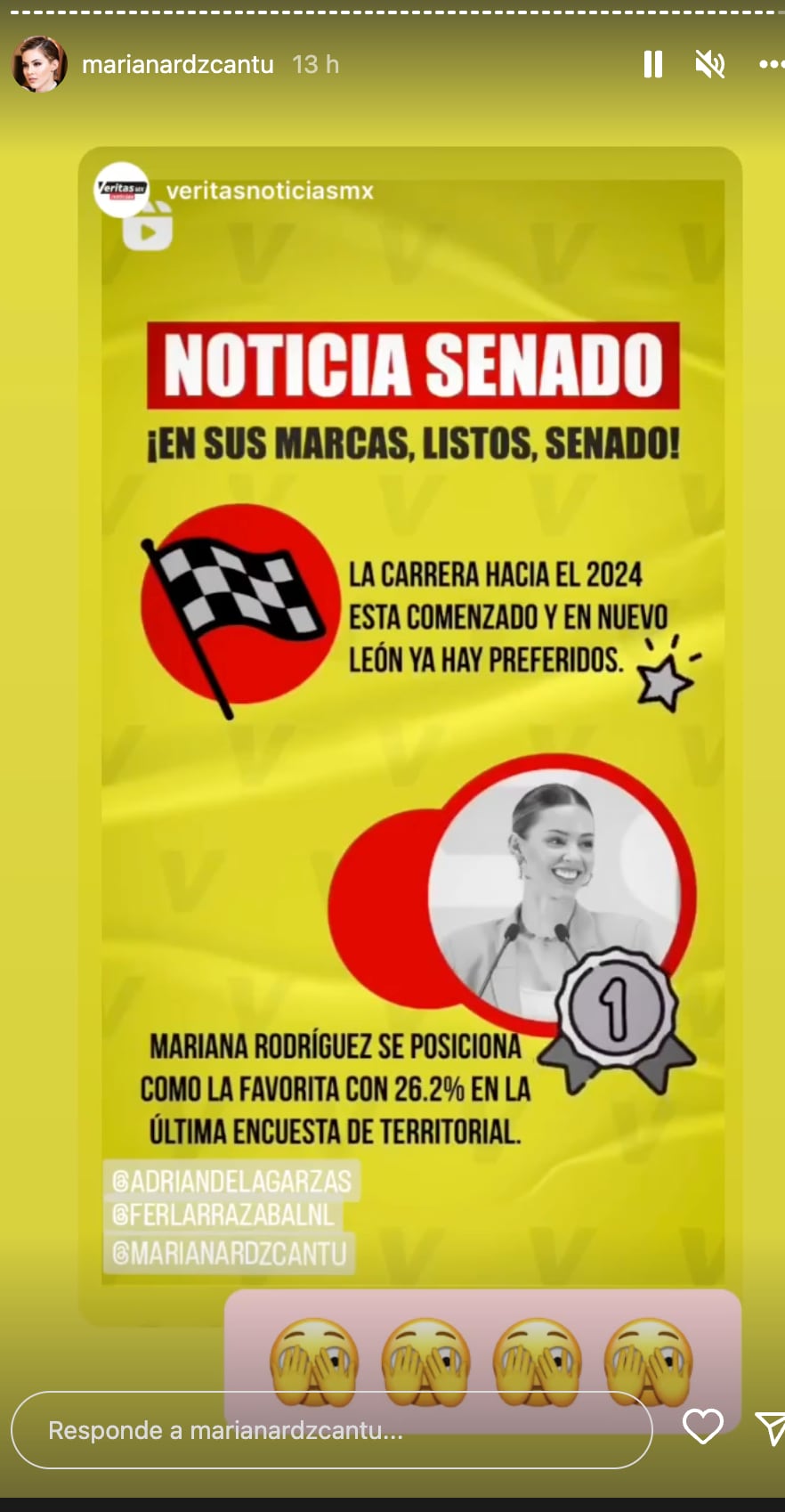 A través de Instagram, compartió la historia de un portal de noticias que informa que la carrera hacia las elecciones 2024 inició en la entidad y Rodríguez es la número uno.