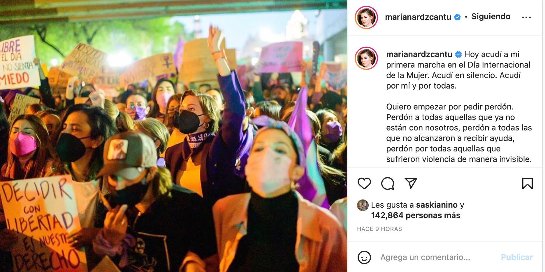 Desde redes sociales, Mariana Rodríguez aseguró que acudió a la marcha en silencio y pidió perdón por “todas aquellas que ya no están”.