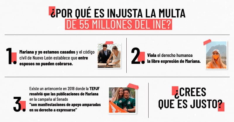Asimismo, asegura que la multa de 55 millones de peso que impuso el INE viola dos derechos humanos de libre expresión de su esposa Mariana.