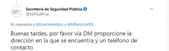 Por su parte la Secretaría de Seguridad Pública del estado de Puebla ha respondido al hilo de Estefanía Veloz pidiendo que la información sea enviada por mensaje privado.