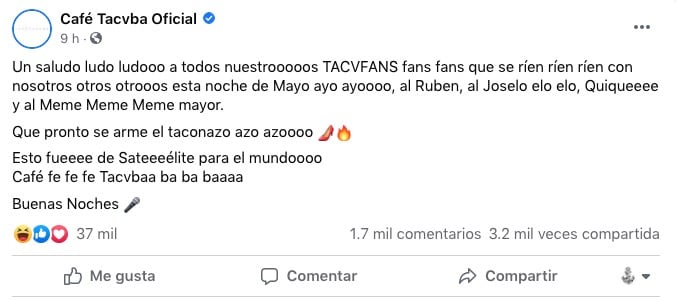 “Un saludo ludo ludooo a todos nuestrooooos TACVFANS fans fans que se ríen ríen ríen con nosotros otros otrooos esta noche de Mayo ayo ayoooo, al Ruben, al Joselo elo elo, Quiqueeee y al Meme Meme Meme mayor.