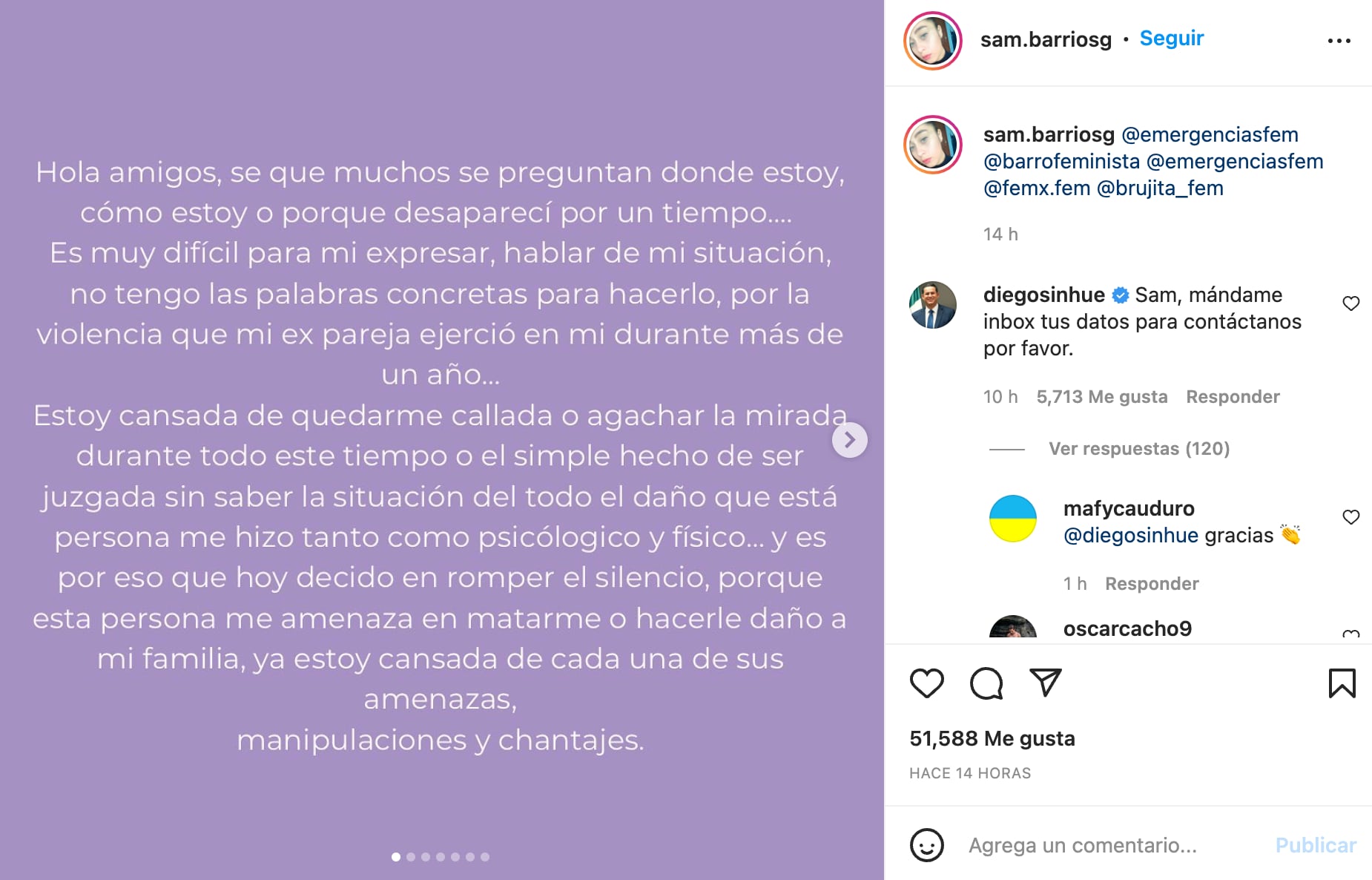 Sam Barrios compartió su situación como víctima de abusos físicos y emocionales por parte de su expareja, Carlos Alberto Muñoz Vázquez.