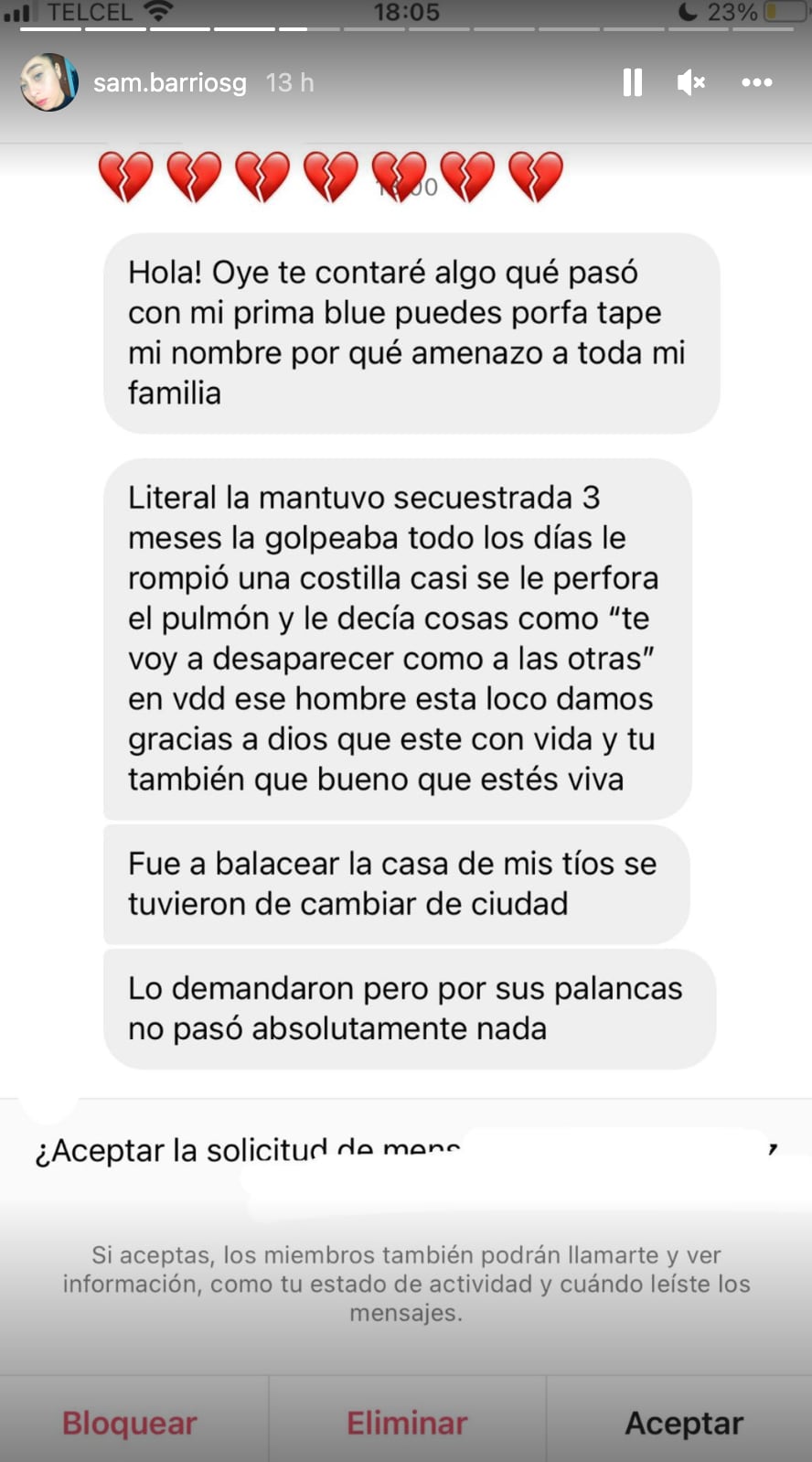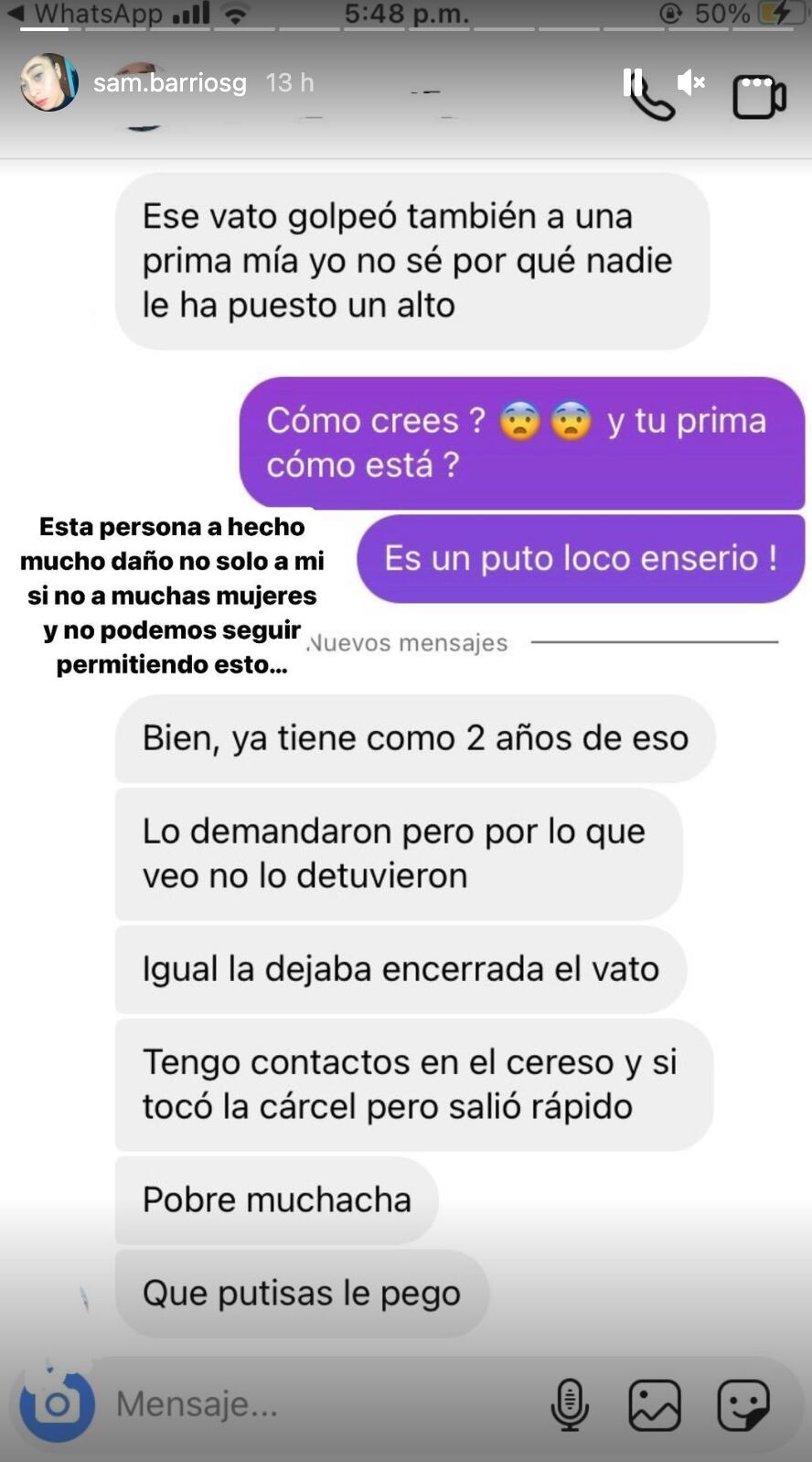 Además, amenazó a la familia de ésta víctima y “fue a balacear” la casa de los padres de la víctima; a pesar de que se denunció, no fue detenido, aseguró el testimonio compartido a la influencer Sam Barrios.