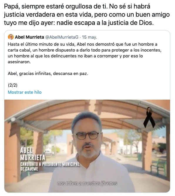 Mónica Murrieta, hija del candidato por Cajeme, Sonora, Abel Murrieta, le dedicó un emotivo mensaje a unos días de su asesinato.
