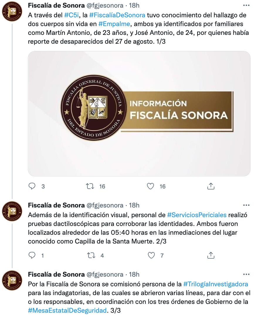 Alrededor de las 5:40 horas, ambos fueron localizados muertos cerca de la carretera Libramiento Federal Guaymas. Hermosillo, a la altura de la capilla de la Santa Muerte.