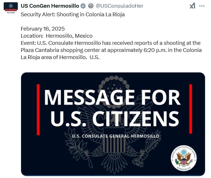 Luego de que se registrara el ataque armado en donde murió el empresario Carlos Tirado, el consulado en Hermosillo de Estados Unidos emitió una alerta.
