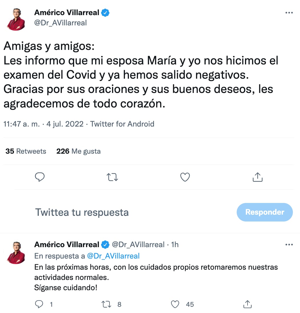 “Amigas y amigos: Les informo que mi esposa María y yo nos hicimos el examen del Covid y ya hemos salido negativos.Gracias por sus oraciones y sus buenos deseos, les agradecemos de todo corazón…En las próximas horas, con los cuidados propios retomaremos nuestras actividades normales. Síganse cuidando!”