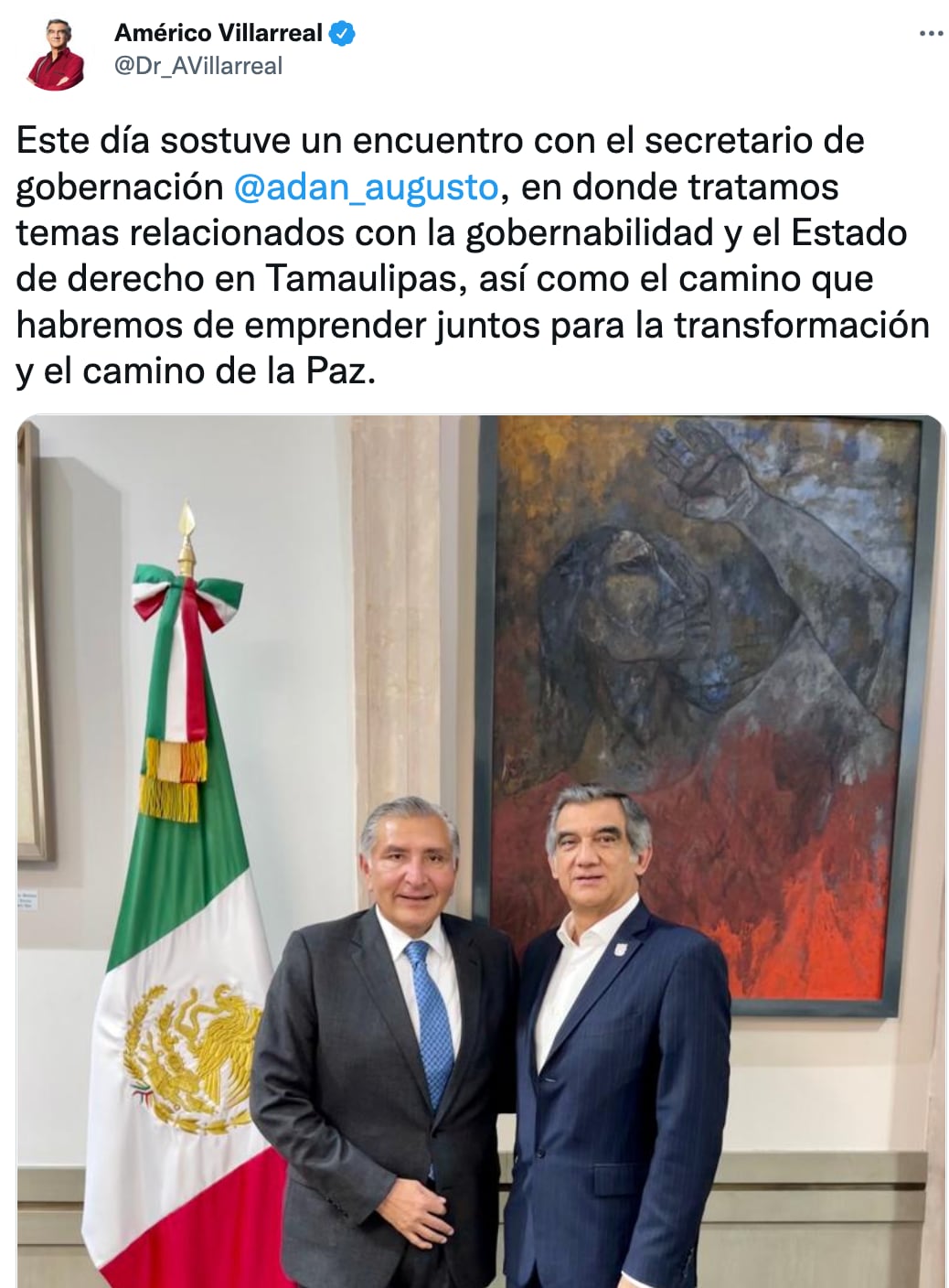 “Este día sostuve un encuentro con el secretario de gobernación @adan_augusto, en donde tratamos temas relacionados con la gobernabilidad y el Estado de derecho en Tamaulipas, así como el camino que habremos de emprender juntos para la transformación y el camino de la Paz”