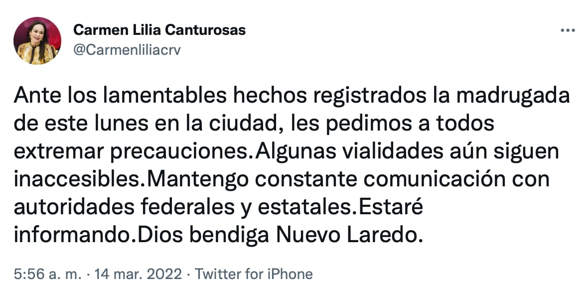Por su parte, la alcaldesa de Nuevo Laredo, Carmen Lilia Canturosas, lamentó los hechos de violencia que desataron las balaceras y bloqueos durante la madrugada de este lunes.
