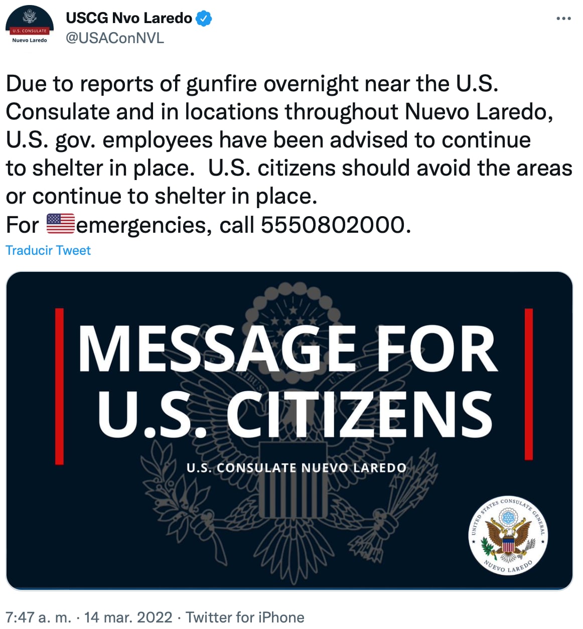 También puso a disposición de los ciudadanos estadounidenses en Nuevo Laredo el número de emergencias 5550802000 por si requieren apoyo tras las balaceras registradas las mañana del 14 de marzo.