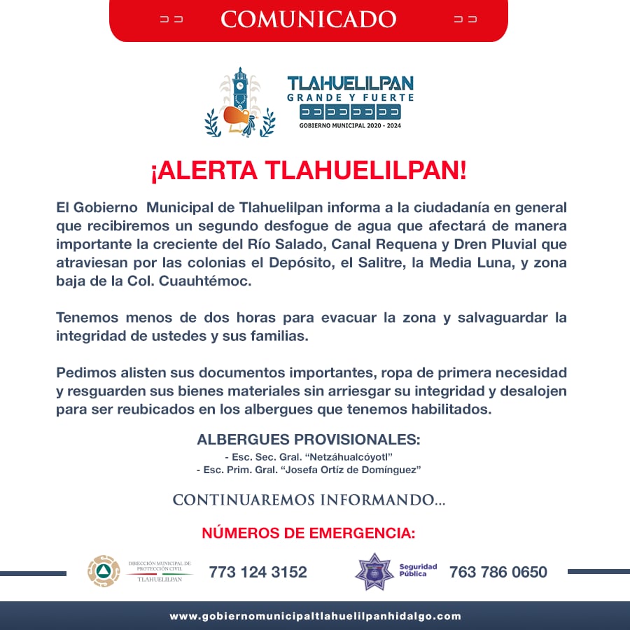 Por otra parte, el gobierno de Tlahuelilpan pidió a la ciudadanía resguardar sus bienes materiales siempre y cuando esto no arriesgara su integridad.