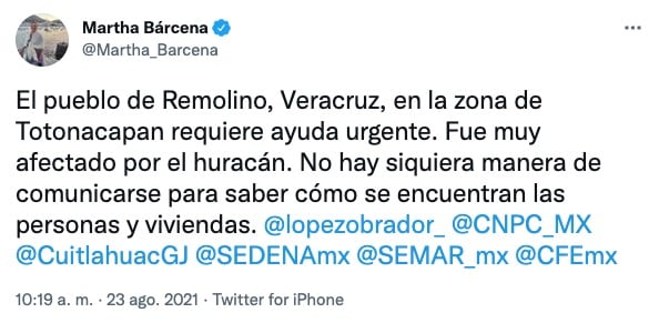 En su cuenta de Twitter, Martha Bárcena hizo un llamado a autoridades del Gobierno de Veracruz, así como al federal, para que ayuden al pueblo Remolino.