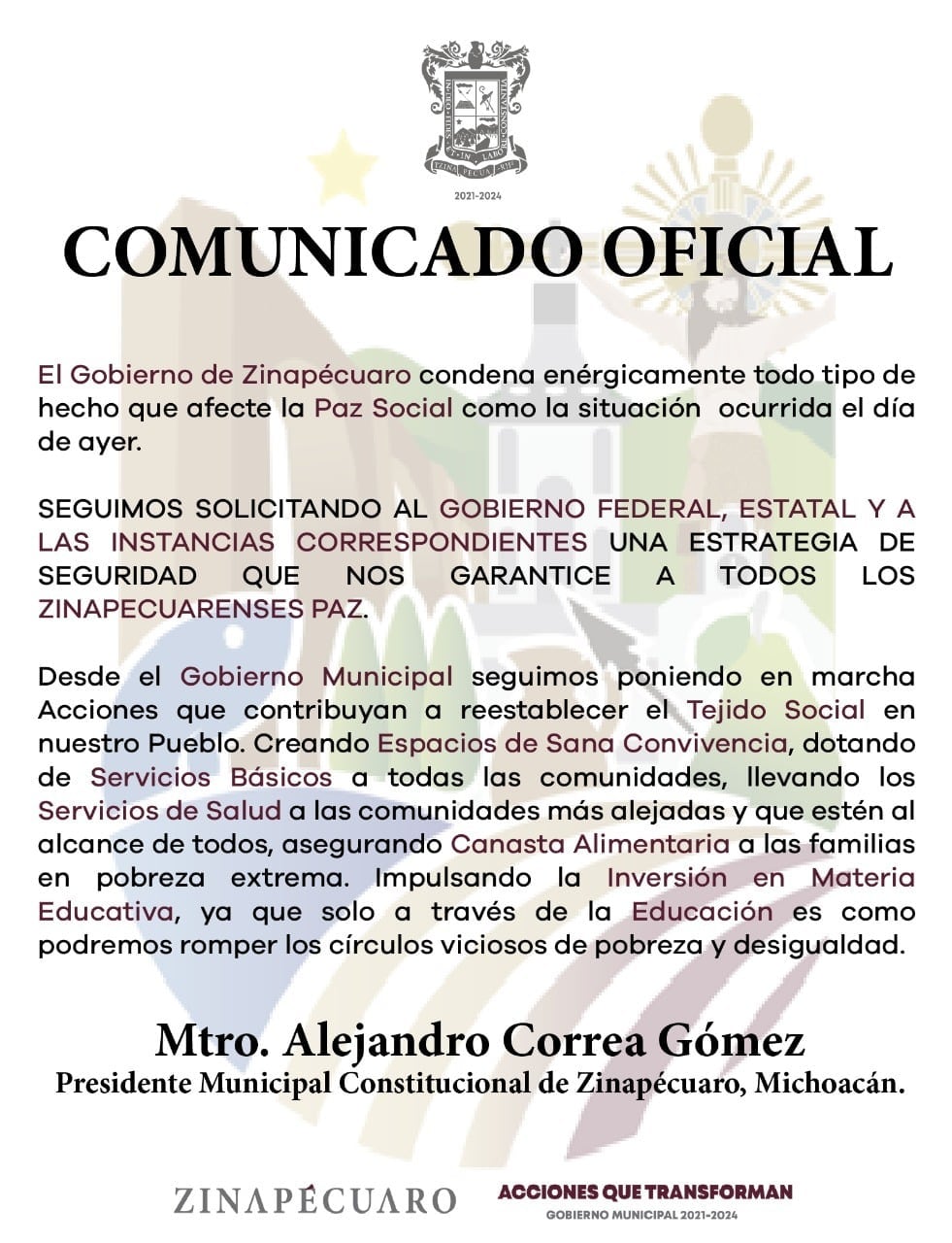 Fue hasta la tarde del lunes 28 de marzo cuando el alcalde publicó un comunicado en redes sociales donde condenó los hechos ocurridos en Zinapécuaro, municipio que gobierna.