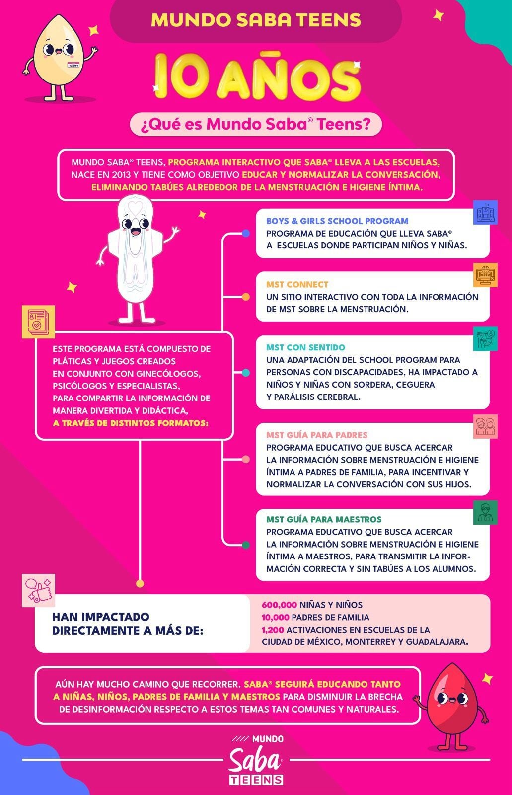 Este programa que alcanza su primera década de vida comparte información creada en conjunto con ginecólogos, psicólogos y especialistas, para educar a través de una manera divertida y didáctica a niñas, niños, sus papás y sus maestros. Para alcanzar su objetivo de normalizar la plática de todos estos temas Mundo Saba Teens (MST) trabaja con varios formatos.