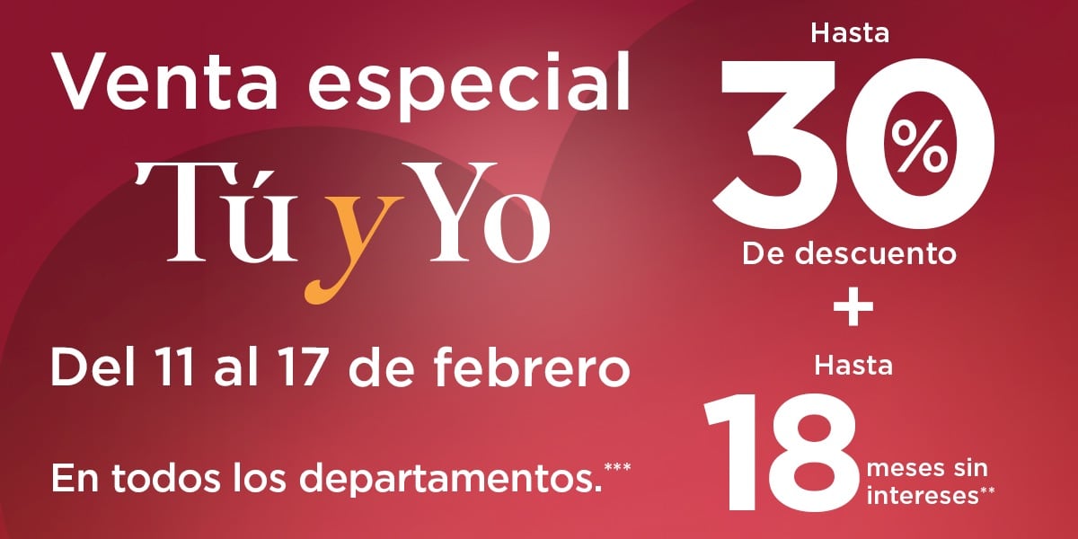 Aprovecha las promociones y encuentra ese detalle único para la persona más especial de tu vida. ¡No dejes pasar la oportunidad de aprovechar hasta un 30% de descuento y hasta 18 meses sin intereses en todos los departamentos! Visita las tiendas físicas o compra en línea del 11 al 17 de febrero. Recuerda que puedes recoger tu producto en tienda a las 2 horas de haber comprado en línea. Asegúrate de sorprender a esa personita especial con algo que realmente adore.