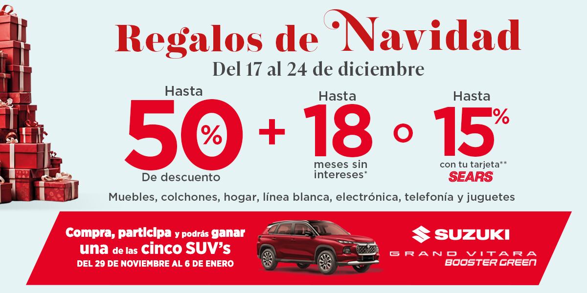 Cabe resaltar que al comprar en Sears participas para ganar una camioneta Suzuki Grand Vitara 2024. Por cada compra de $1,000.00 pesos con cualquier forma de pago, ya sea en tienda o en línea, recibirás un boleto para participar en el sorteo de una de las 5 camionetas Suzuki Grand Vitara 2024. ¡No olvides pedir tu boleto al momento de pagar!