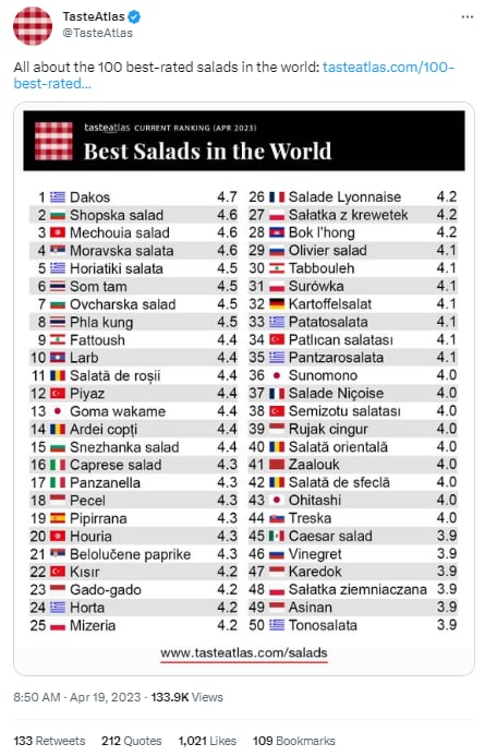 La famosa guía culinaria Taste Atlas, esta vez hizo un recuento de lo que considera son las 100 ensaladas más deliciosas del planeta.