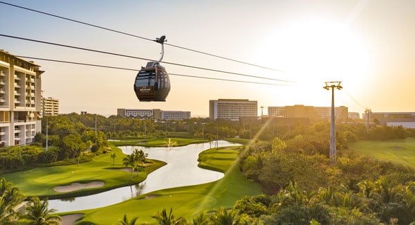 El primer teleférico en un resort de playa alrededor del mundo. Conecta las más de 1,000 hectáreas del resort en minutos con un circuito de más de 6 kilómetros, con 5 paradas. Vuela hasta 48 metros de altura e incluye cabinas con piso de cristal para disfrutar del paisaje.