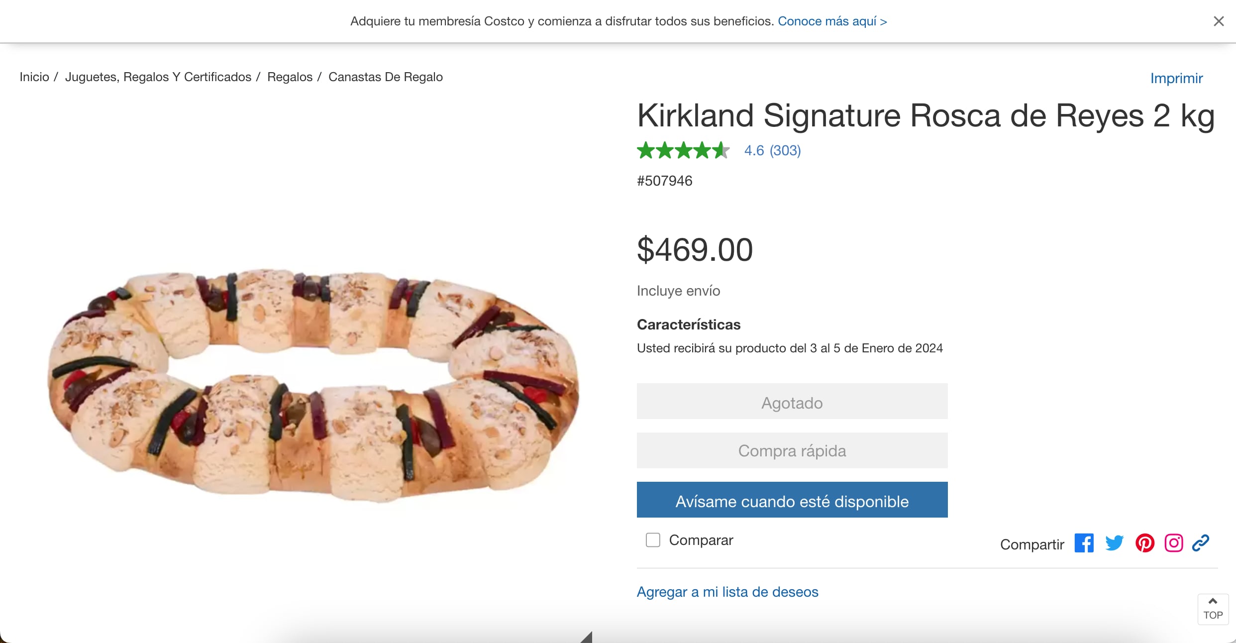 Tal y como se especifica en la página de Costco, su Rosca de Reyes puede comprarse en línea a un precio de 249 pesos la de dos kilos.