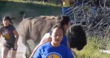 La tranquilidad del bisonte se transforma en furia y comienza a perseguir a las personas que corren despavoridas.