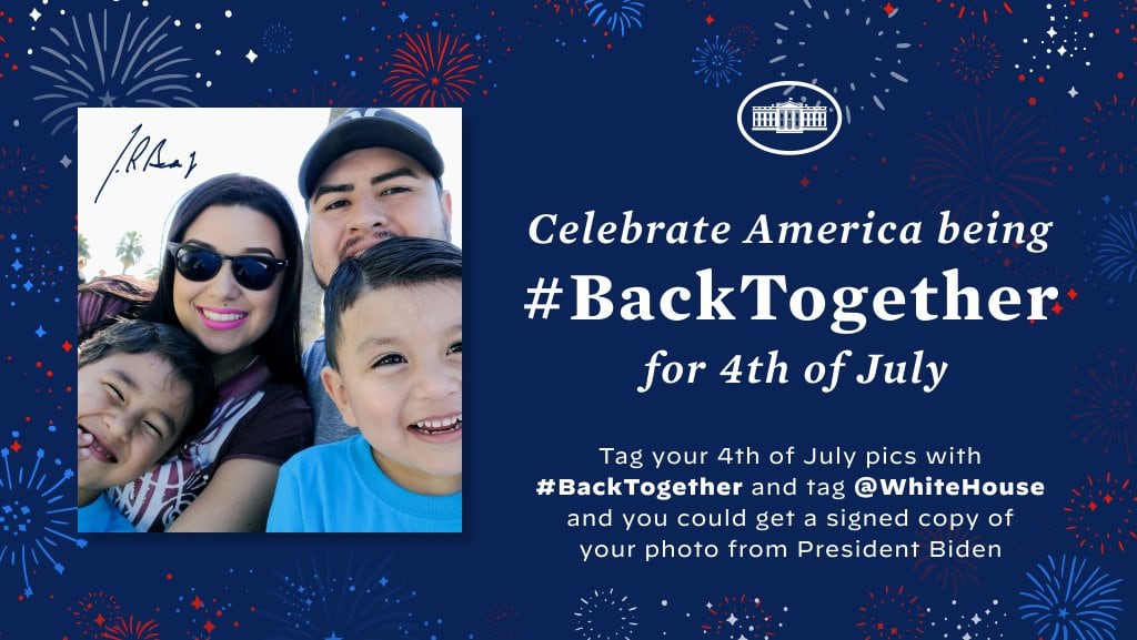 Incentivando a los estadounidenses a compartir sus fotografías reunidos nuevamente etiquetando a la cuenta oficial de la Casa Blanca durante este 4 de julio.