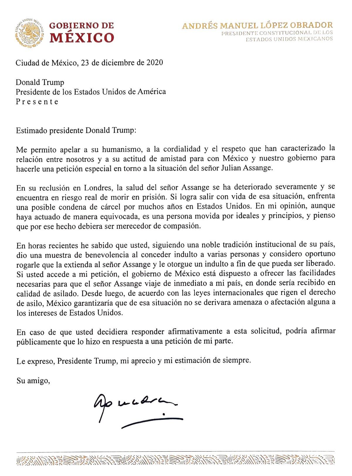 El 23 de diciembre de 2020 AMLO envió una carta al entonces presidente Trump para pedir compasión para el fundador de Wikileaks.