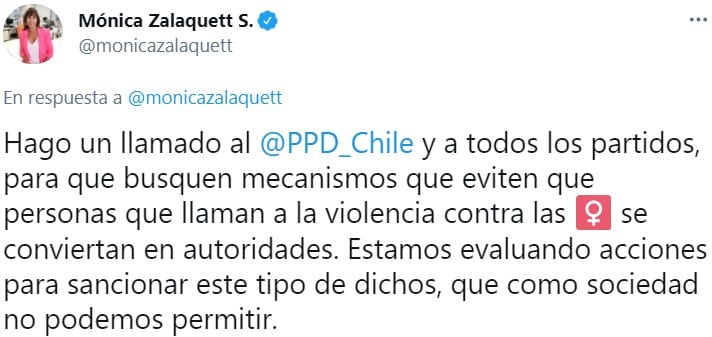 A través de Twitter, Mónica Zalaquett Said, titular de la dependencia federal, anunció que estudia imponer sanciones al Concejal electo por llamar a cometer feminicidios:
