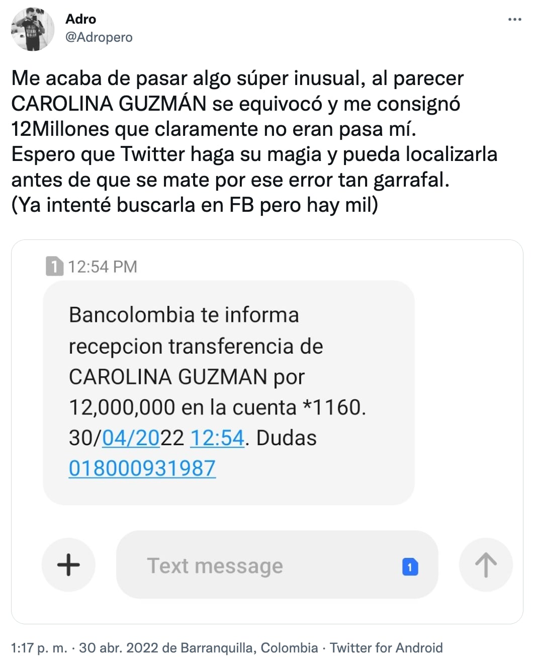 Además, pidió ayuda de la comunidad de twitter para localizar a “Carolina Guzmán”, de quien venía la transferencia, para poder localizarla y devolverle su dinero.