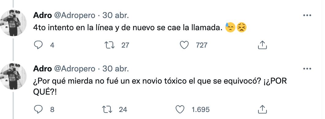 “Verme @Bancolombia la llamada se cae más que su app. 4º intento en la línea y de nuevo se cae la llamada. ¿Por qué mierda no fue un ex novio tóxico el que se equivocó ¿POR QUÉ?”