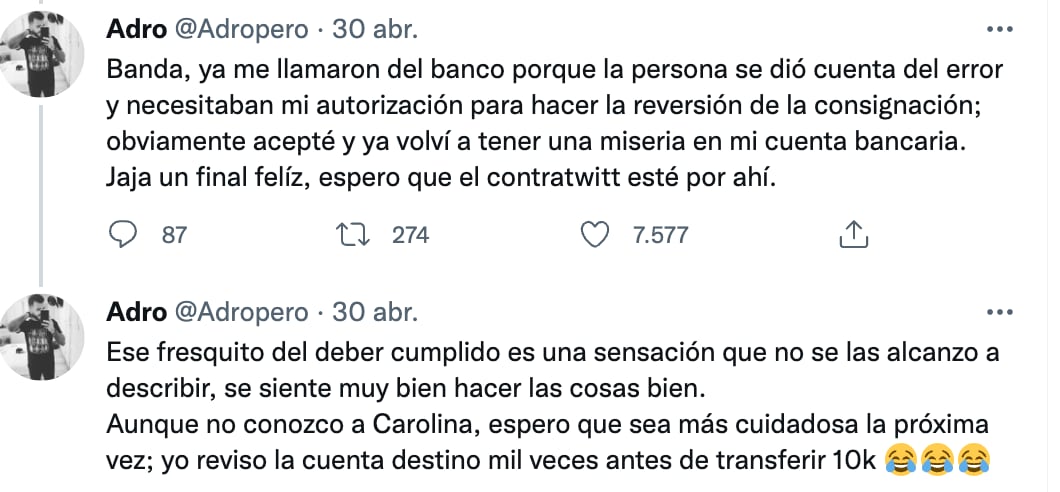 “Banda, ya me llamaron del banco porque la persona se dió cuenta del error y necesitaban mi autorización para hacer la reversión de la consignación; obviamente acepté y ya volví a tener una miseria en mi cuenta bancaria. Jaja un final felíz, espero que el contratwitt esté por ahí”