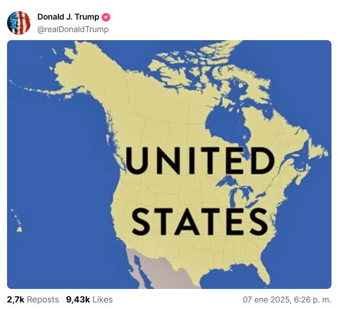 Como parte de sus ideas expansionistas, en pleno siglo XXI, Donald Trump reveló una expansión del mapa de Estados Unidos que integra a Canadá y Groenlandia como sus territorios.