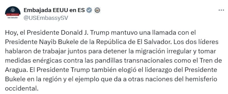 De acuerdo con la propia embajada de Estados Unidos en El Salvador, tanto Donald Trump como Nayib Bukele acordaron detener la migración ilegal, así como implementar medidas para combatir a padillas de origen extranjero.