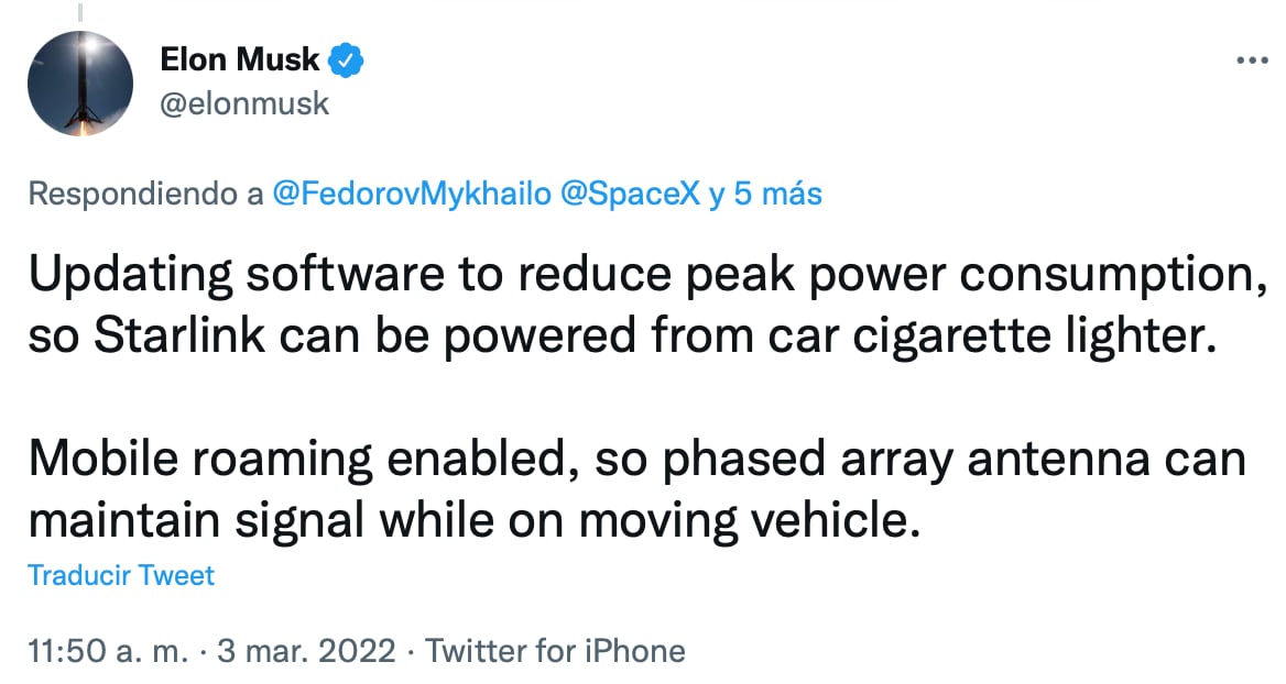 “Actualización del software para reducir el consumo máximo de energía, de modo que Starlink pueda alimentarse desde el encendedor de cigarrillos del automóvil. Itinerancia móvil habilitada, por lo que la antena de matriz en fase puede mantener la señal mientras se encuentra en un vehículo en movimiento"