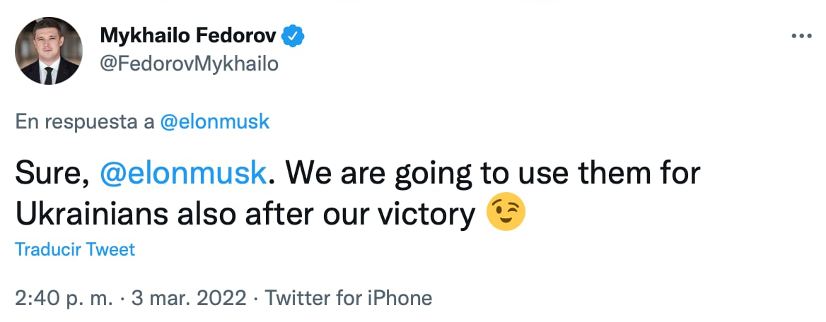 “Claro, @elonmusk . Los vamos a usar para los ucranianos también después de nuestra victoria”