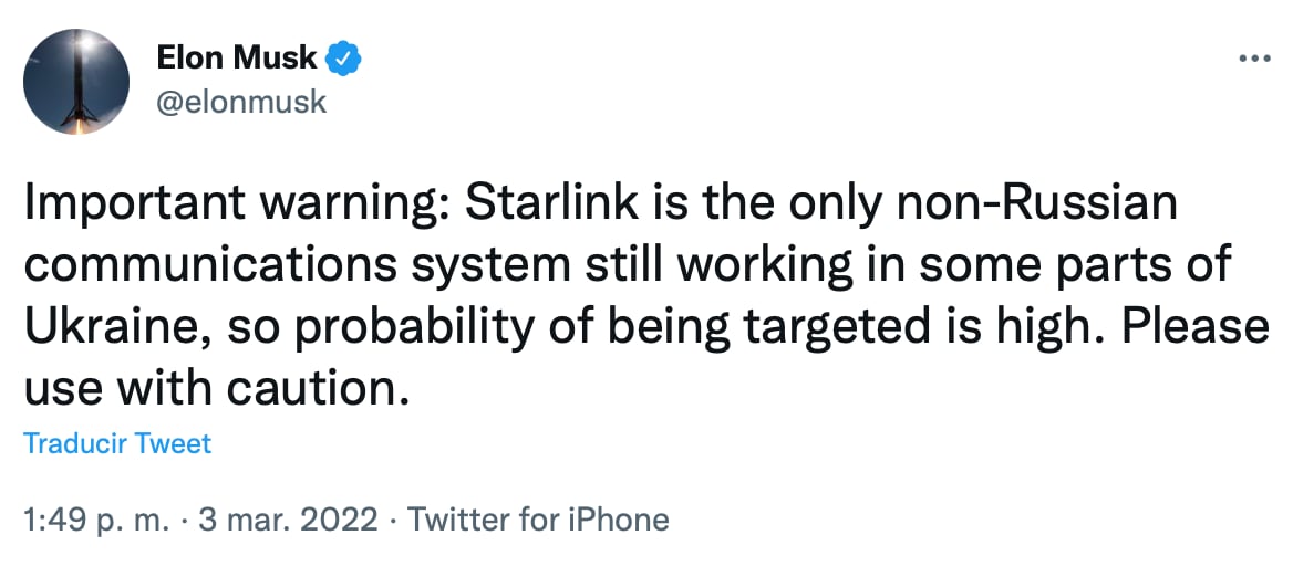 “Advertencia importante: Starlink es el único sistema de comunicaciones no ruso que aún funciona en algunas partes de Ucrania, por lo que la probabilidad de ser objetivo es alta. Úselo con precaución”