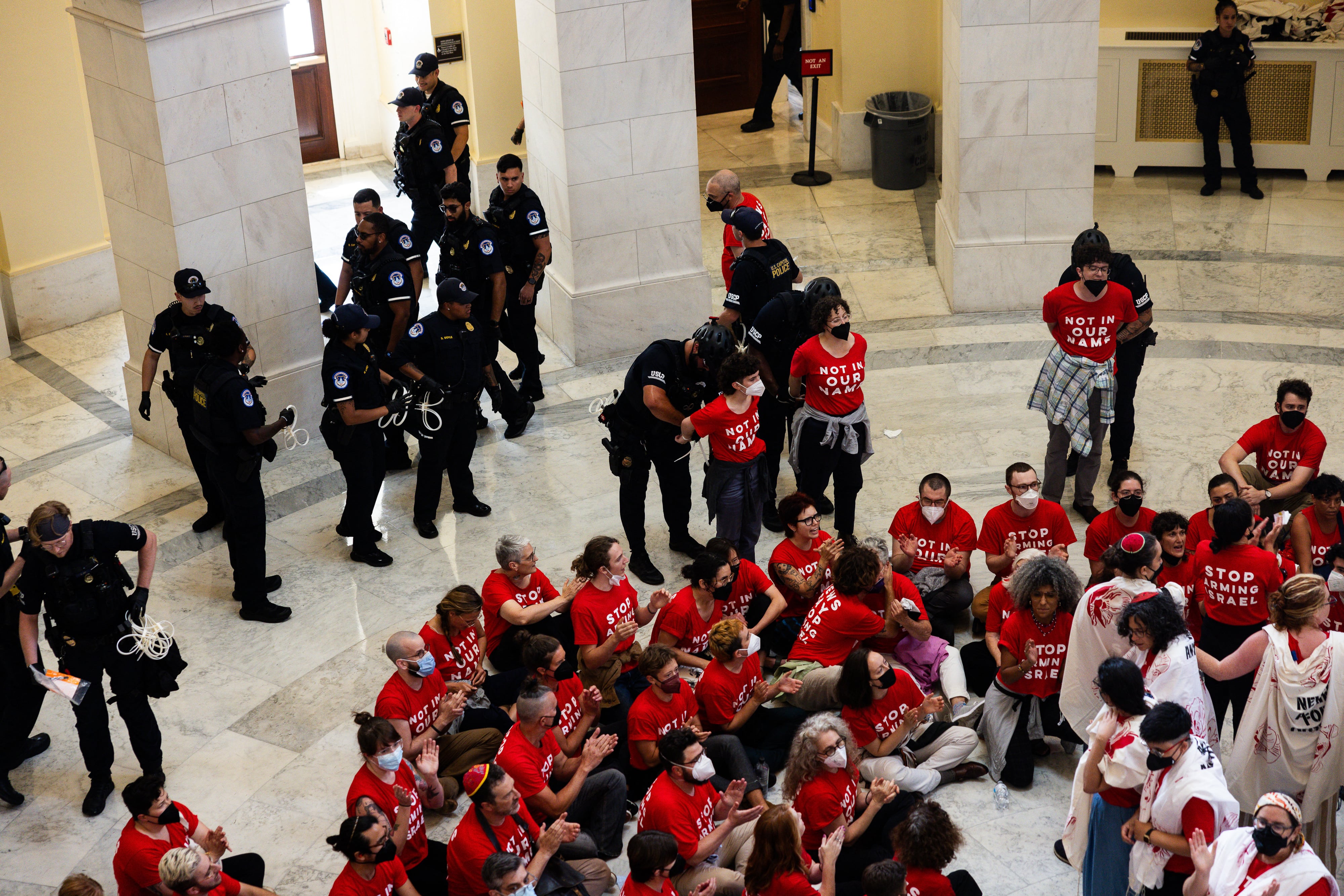 Asimismo, un grupo de más de 200 personas, integrantes de la organización “Voces judías por la Paz”, se congregaron para protestar por la visita del Primer ministro israelí en el edificio Canon House, también en Washington, DC.