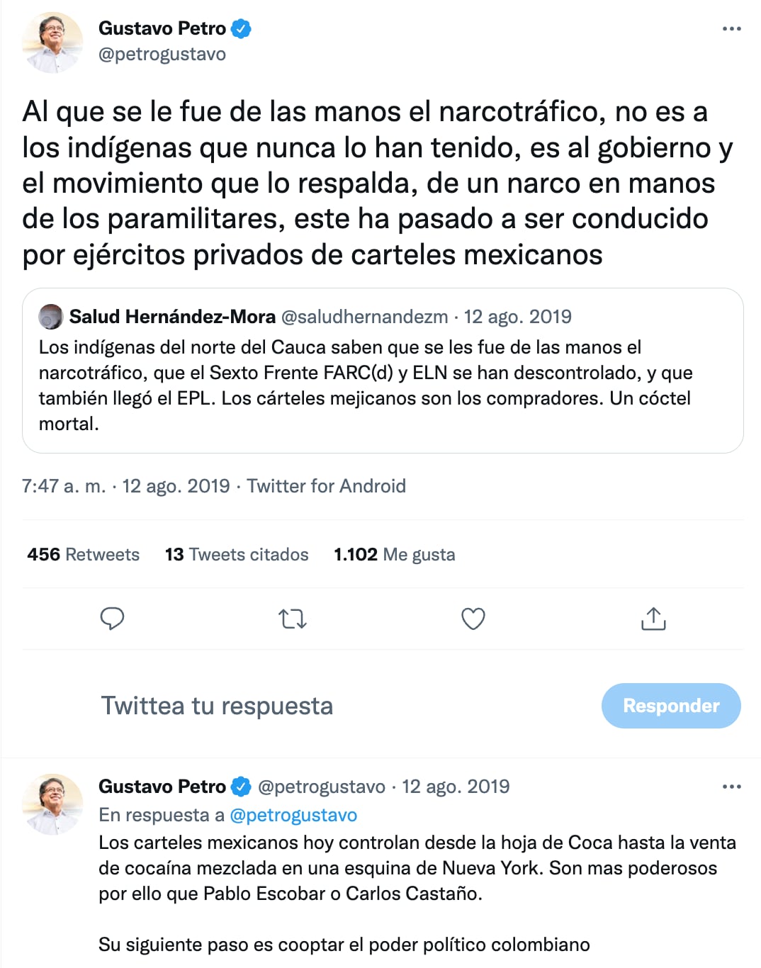 Se trata de una declaraciones que realizó desde Twitter en 2019, donde habló de la influencia de los grupos delictivos mexicanos en Colombia.