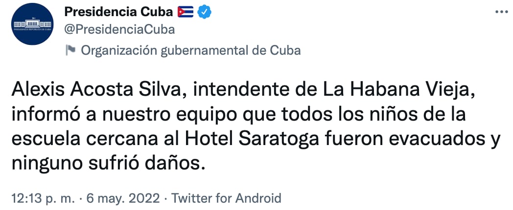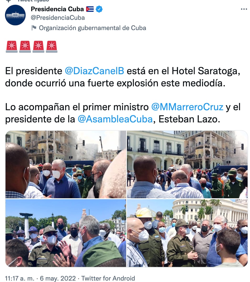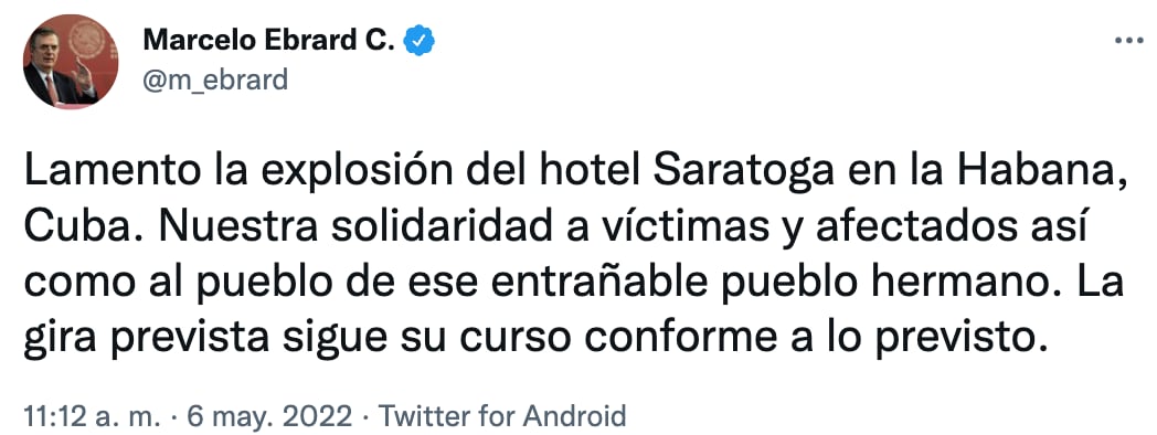 “Lamento la explosión del hotel Saratoga en la Habana, Cuba. Nuestra solidaridad a víctimas y afectados así como al pueblo de ese entrañable pueblo hermano. La gira prevista sigue su curso conforme a lo previsto”