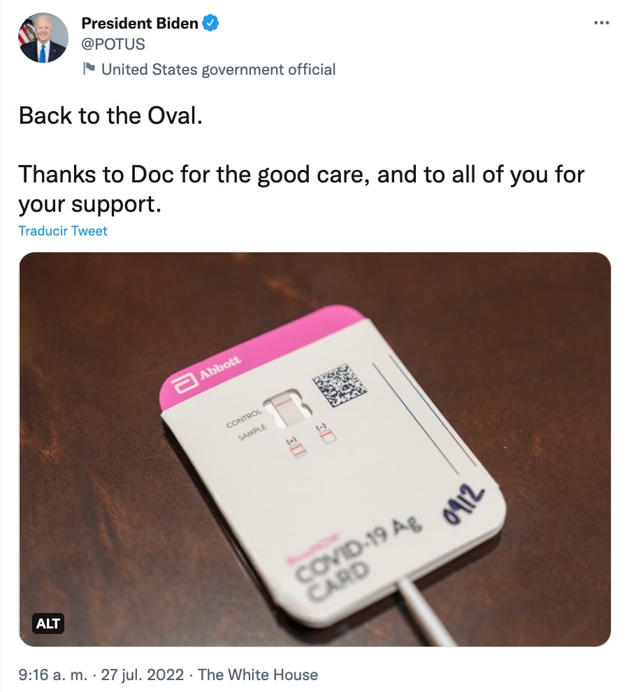 El presidente de los Estados Unidos, Joe Biden, de 79 años, compartió que resultó negativo en la prueba Covid-19 que se aplicó la mañana de este 27 de julio.